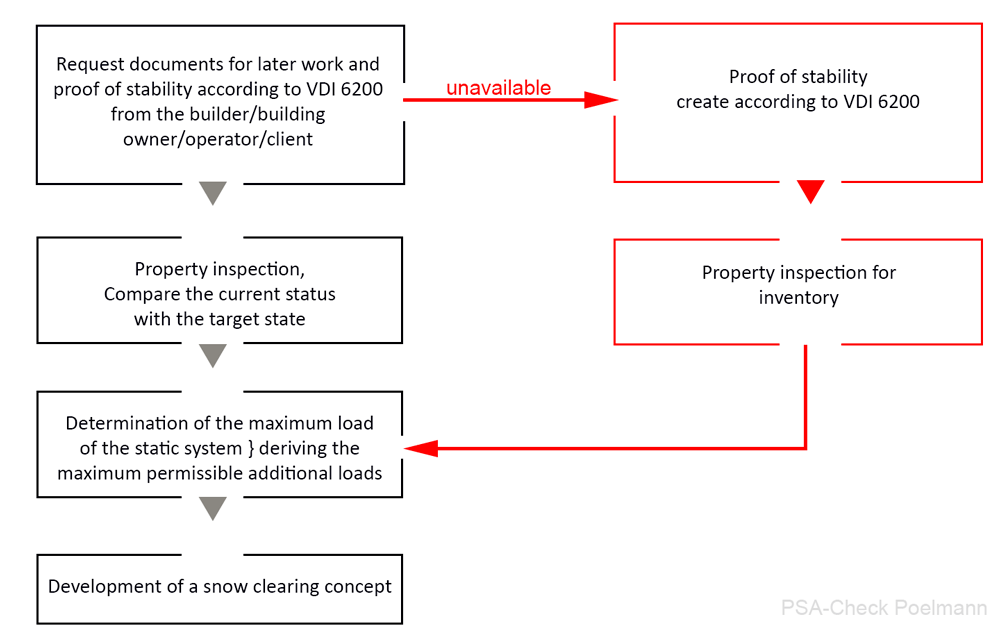 The determination of the current condition of the building and the static checks required for carrying out the snow clearance must be carried out by a competent person. In order to carry out snow clearing safely, a limit value must be determined which must be determined as part of the risk assessment for the safety concept. This results from the permissible additional load reduced by a safety factor. Snow removal is still permitted up to this limit.